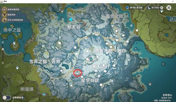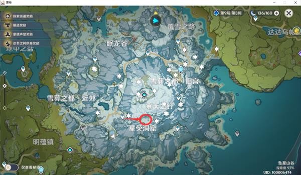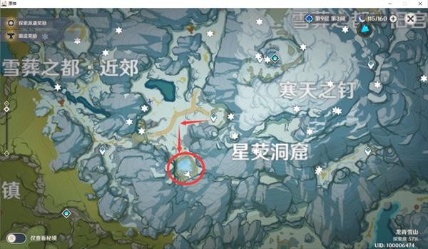 1.还是星荧洞窟左侧传送点,以地图方向为基础,直接翻山来到右边空地(也就是地图上星荧洞窟和寒天之钉中间的空地);