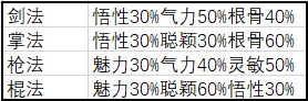 剑法对应刀法加成,掌法对应拳法加成,枪法对应九流,棍法对应奇门。