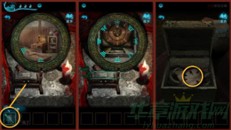 点击戏台位置左侧的石狮,按照平台图中木匣子上盖位置的线索输入,左侧石门打开