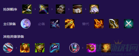 2、装备推荐:主c艾希【破甲弓、飓风、死亡之刃、无尽、决斗转】;