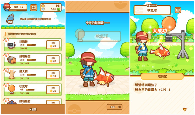 修炼方法也很简单明了,喂食-特训-联赛比赛。点击鱼池里的坚果喂鲤鱼王,增加CP值(跳跃能力)。