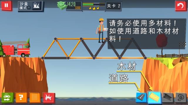 当然,游戏中的一些致命缺陷也不容忽视。建桥材料的种类太少(只有4种),太容易挑战整个关卡的设计。搭桥就像积木一样,需要拼接起来。这不如另一款建桥游戏《保利桥》中的复制粘贴工具方便;