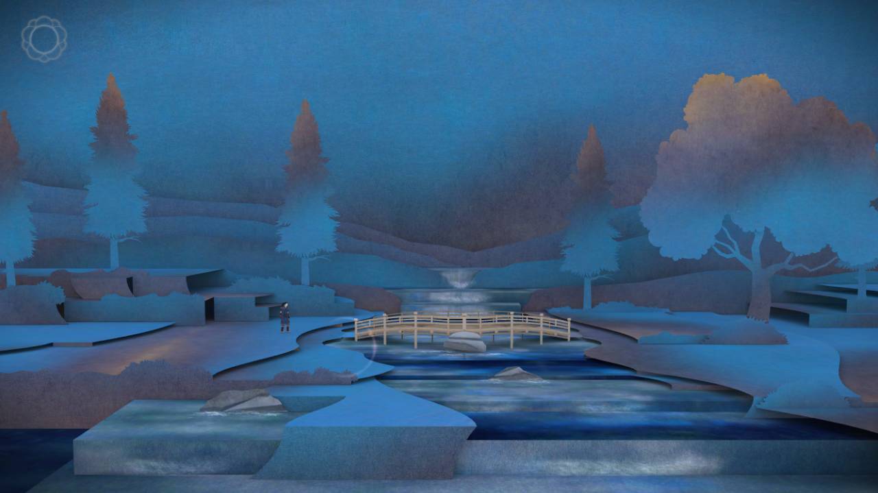 但这就是拼图设计如此聪明的地方。游戏充分利用了纸张优秀的“折叠”特性,场景切换隐藏在千山万水之下。例如,你需要建造一座桥来“过河”。眼前的激流从瀑布中流出,如果玩家不小心拉动了瀑布,一个古朴的桥面就会出现在眼前。