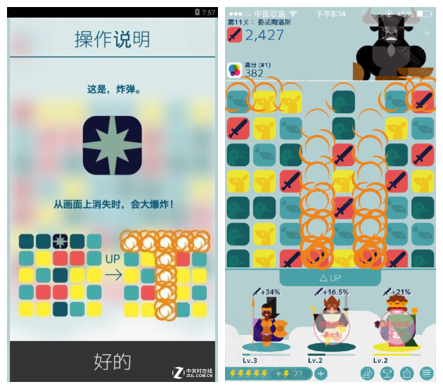 “长按”滑动相同颜色的方块会合成更高的数值,给你更多的经验,给你的敌人更强大的打击。