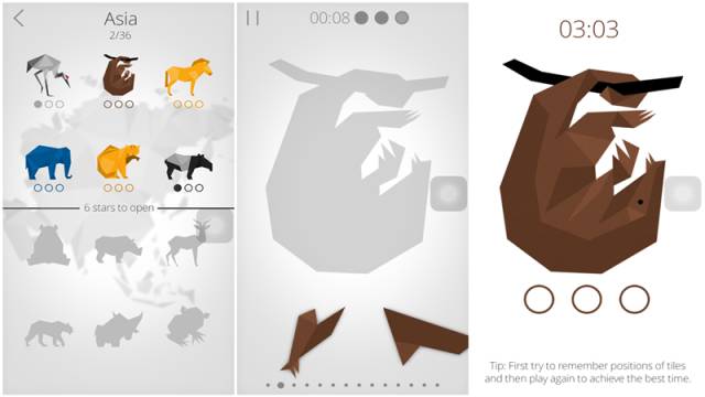 游戏使用了中国七巧板元素,BGM也是纯正典雅的古乐。将拼图旋转到位并制作动物原型。