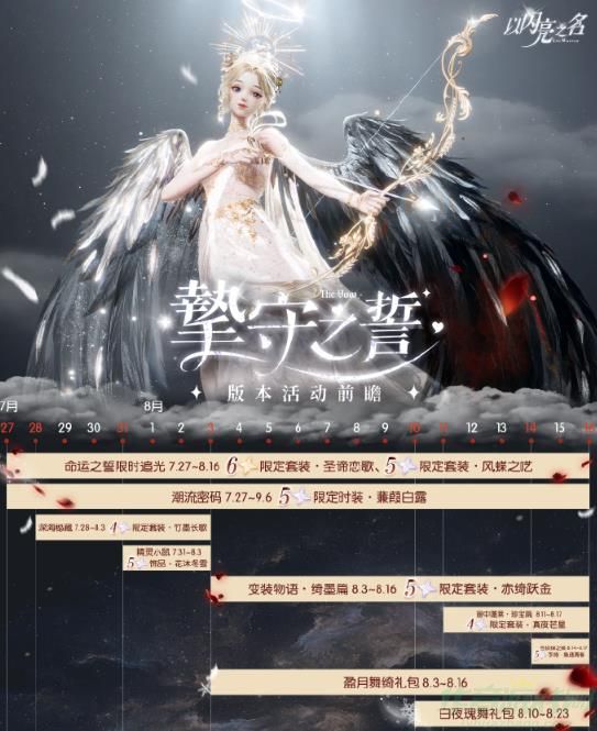7月27日10:30,限定追光活动【命运之誓】上线!全新六星套装及SSR羁绊限时登场!该追光活动每登场25次内必得新限定六星套装部件(直至集齐限定六星套装)。集齐限定六星套装还可激活专属出场动作(摄像机镜头动态动作)【圣谕弦矢】,并可在拍照-动态动作里使用。此外,【追光·命运分解】商店也将同期限时开启,通过分解该限时追光活动内的服饰,可获得限定时装部件【星光咏叹】、【贝斯特的凝视】、【守护者之心】及限定家具、头像装扮、聊天装扮、命运风向标、心念之蝶、知之钥、金币等材料道具!