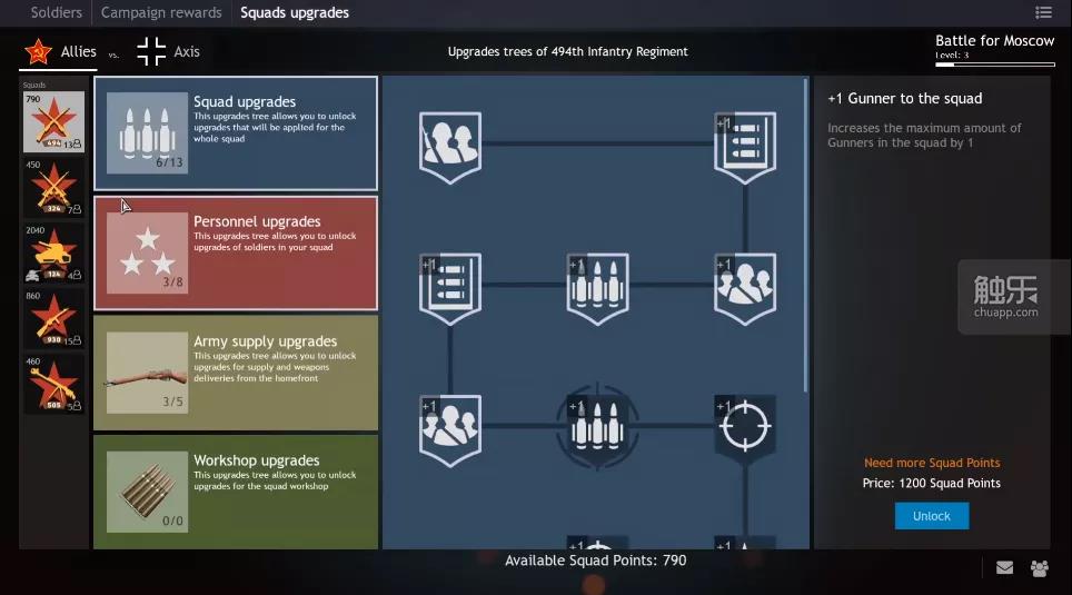 在一场游戏中,多个玩家带领一个团队同时在战场上作战,所以理论上你可以看到几十到几千人在同一个屏幕上战斗的战场。《Enlisted》根据历史战斗的现实设定游戏。玩家可以在无限数量的小队中重生,直到现场战斗结束,始终将士兵投入战斗,就像在真正的战争中一样。这个游戏为第一个玩家提供了一个步枪小队、一个狙击步枪小队和一个坦克小组。随着玩家等级的提升,你可以逐步提升科技树中的各种战斗能力,解锁其他类型的武器。在游戏中,玩家是一名保卫莫斯科的士兵,可能面临着正在推进的敌军。他们的任务不再是杀死所有士兵,而是让敌军脱离轨道。当玩家充当登录动作时与一名成员一起,目标是占领堡垒并加强其防御。这将允许更多的部队登陆海滩。