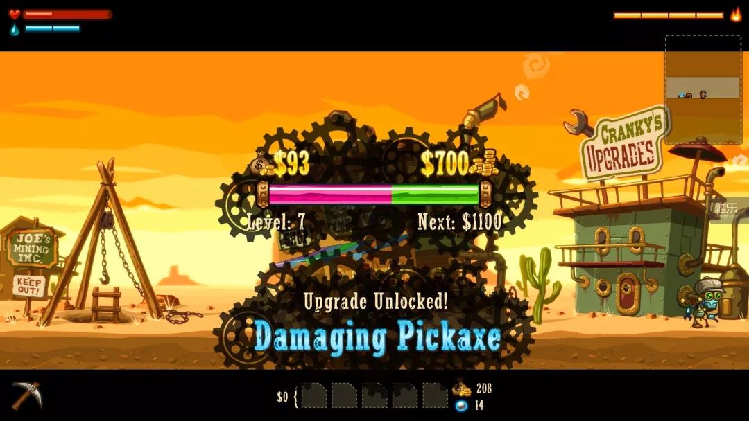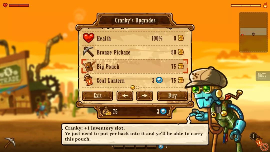 难点在于,在地下世界你必须依靠火把来照明,随着时间的推移,火力的范围越来越小,所有的矿石都可以兑换成金钱,用来购买各种升级。节奏控制很重要,因为在简单的游戏玩法中玩家没有太多选择。这正是《蒸汽世界:挖掘》的成功之处。每当玩家挖得有点累的时候,总是按照任务的指示解锁新元素或者因为包裹满了就降落在地上——这给了他们新的刺激,你总能感受到新鲜感。
