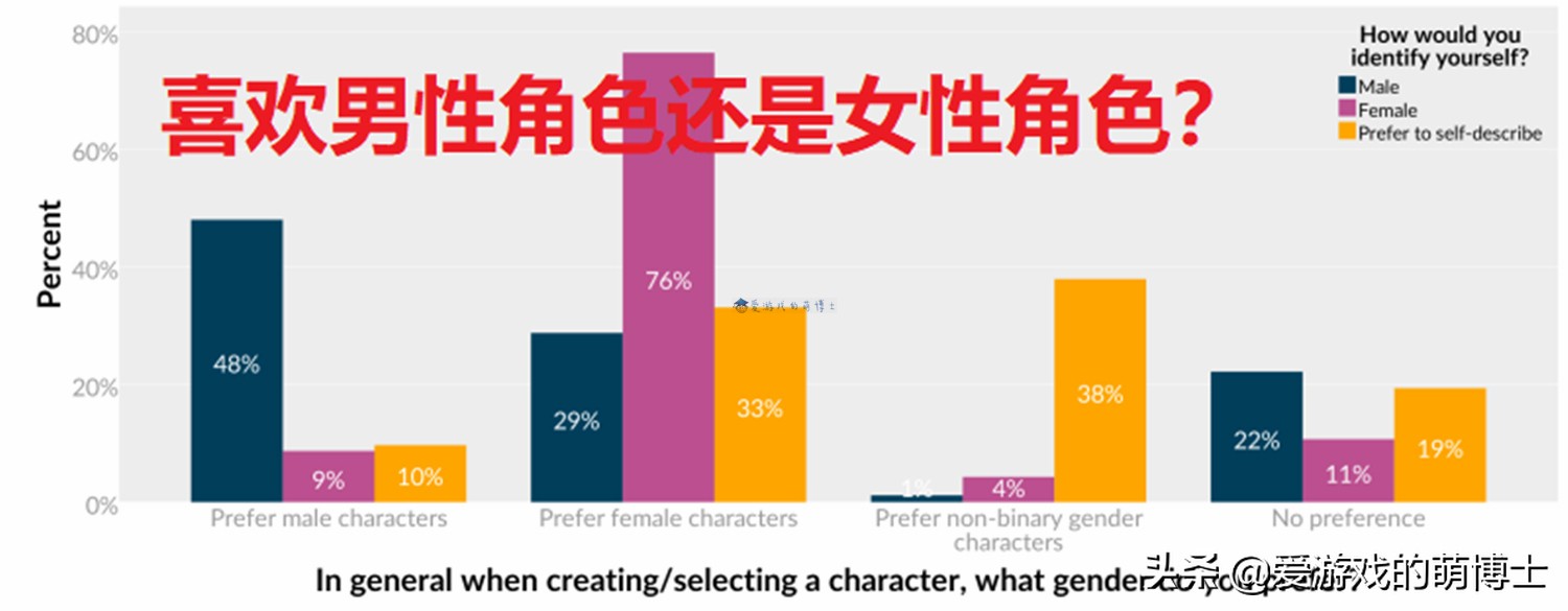 要回答上述问题,只有通过实际研究才能知道答案。近日,我注意到海外网站“Quantic Foundry”正在进行一项关于“男女性别偏好”的大规模调查,在最终报告中,近30%的男性玩家在游戏中扮演女性角色,其中9%女性玩家更喜欢男性角色,不过这个结论似乎符合我们的想象!
