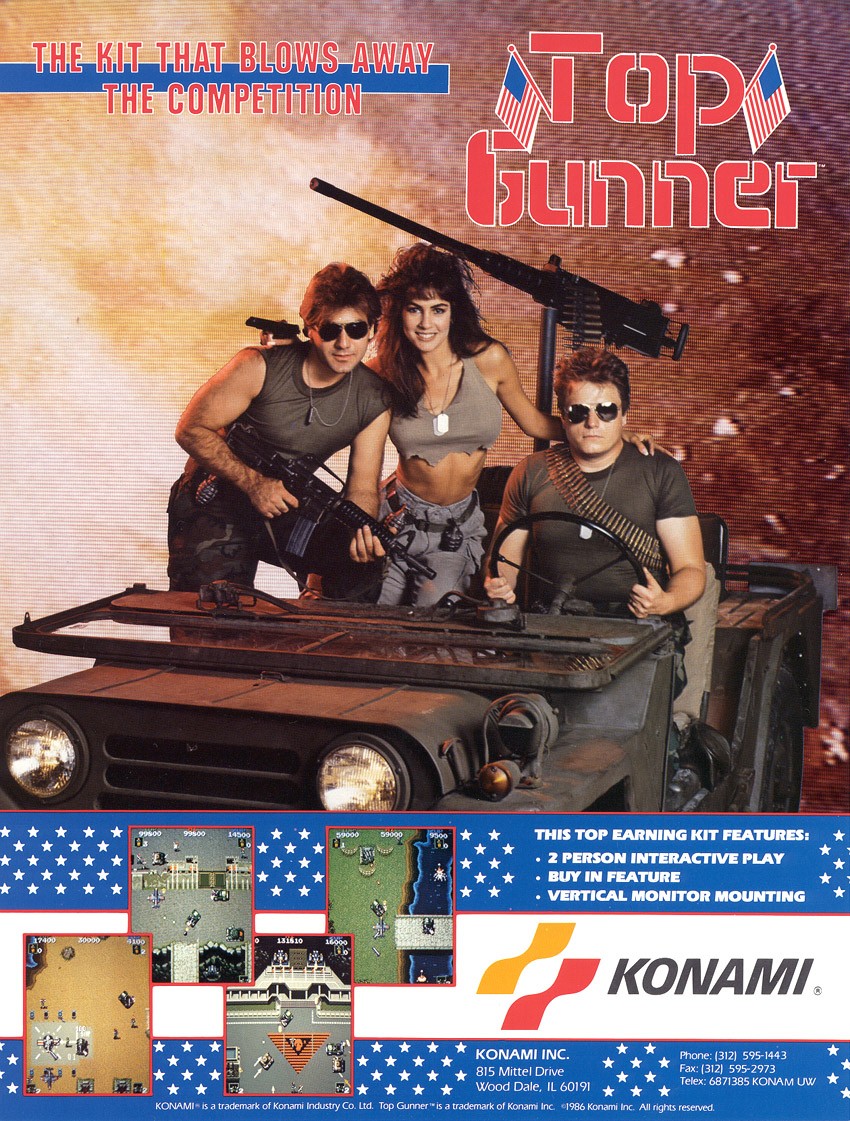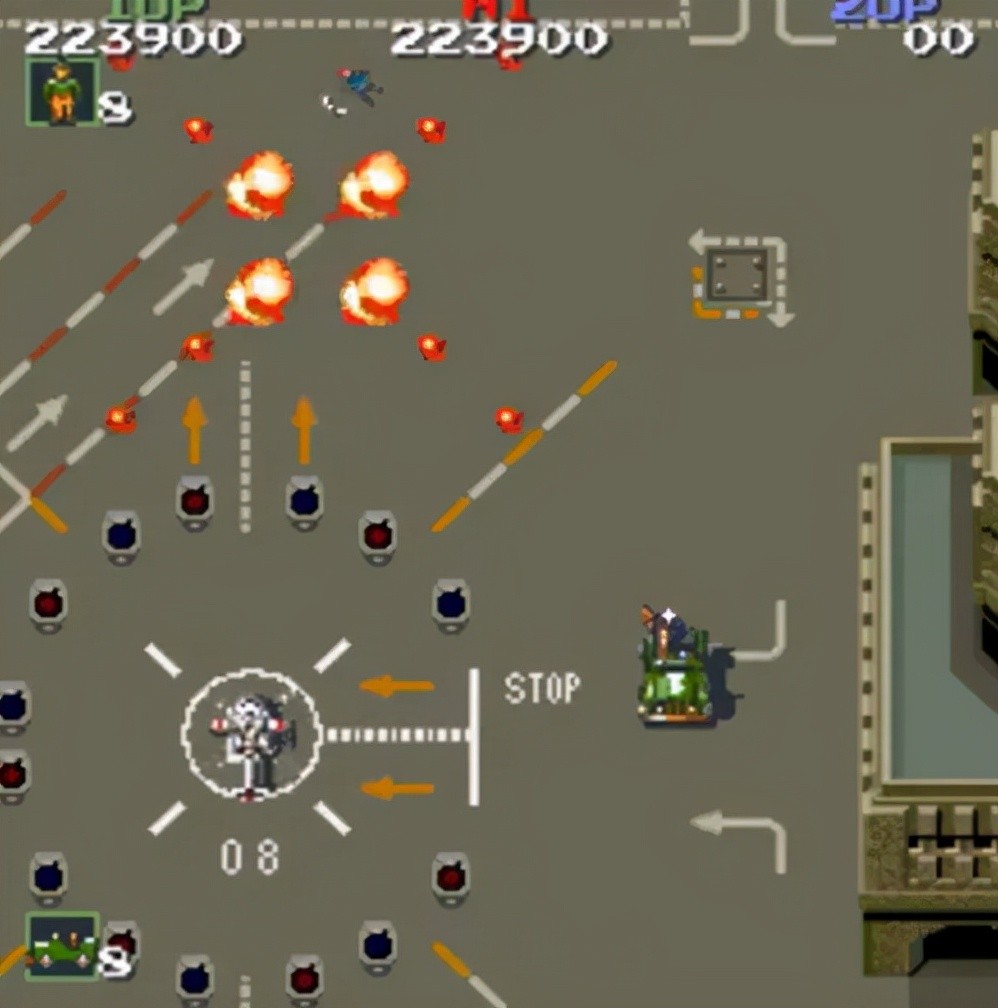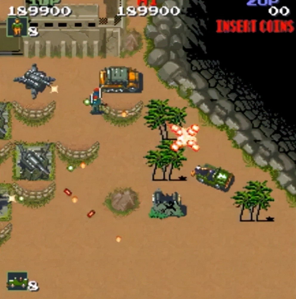 1986年推出的街机版,基本玩法和操作与FC版基本相同,但无论等级高低,玩家都要一口气战斗到底,全内容包括FC版除了第三海港口。第5关,最后只有一个BOSS,就是FC版最后一个大炮台,大炮台被摧毁后的大坦克,上一关的BOSS都不可用。尽管如此,游戏的难度还是比FC版高很多。各种杂兵的数量和火力都极高。新手经常被突如其来的敌人和堡垒杀死。此外,坦克等大型敌人不会爆炸,被击中后直接消失。 ,而是有一个延迟动画,当它爆炸时会杀死敌人。